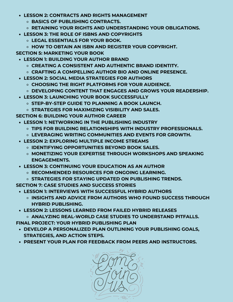 Mastering Hybrid Publishing: Your Roadmap to Author Success! Discover the secrets of hybrid publishing— crafting compelling manuscripts to launching your book with confidence. Whether you’re just starting out or have some experience under your belt, this course will equip you with the tools you need to navigate the publishing world like a pro. ![]()